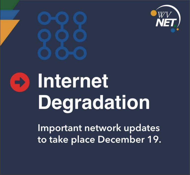 Starting at 6:00 AM on December 19, you may experience suboptimal network performance to the Internet and Internet2 due to an upstream provider infrastructure upgrade (with a potential outage window of 24 hours). This may have an impact on services provided by WVNET.  We recommend rescheduling any significant tasks that are reliant on uninterrupted internet connectivity during this period.